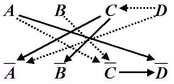 Но наша «экономия» лишних связей на этом не заканчивается. Можно, оказывается, любую E-структуру представить числом связей, в два раза меньшим, чем число связей в диаграмме Хассе. Обратите внимание, что в диаграмме Хассе все связи «ходят парами»: суждение и его контрапозиция. А почему бы нам каждую такую пару не представить всего одним суждением? Ведь все равно изъятое суждение мы получим, применив к оставшемуся суждению правило контрапозиции.