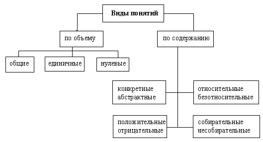 В зависимости от содержания понятия делятся на конкретные виды. Для наглядности представим их в виде схемы, а затем последовательно рассмотрим каждый вид (по содержанию, так как объем понятий не входит в рамки вопроса) более подробно.