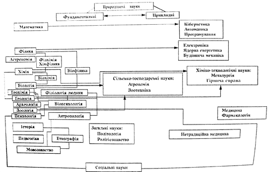 Рис. 1. Сучасні уявлення про взаємозв'язок фундаментальних та прикладних наук