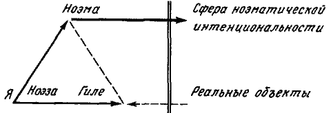 При анализе интенциональной деятельности сознания можно исходить из самих интенциональных переживаний и исследовать структуры этих переживаний в соответствии с тем порядком, в котором они протекают. Данные переживания состоят из трех компонентов: пассивной чувственности – гиле (реальное содержание, получаемое с помощью органов чувств), духовной активности – ноэзы и смыслового компонента – ноэмы (некая связь между интенциональными актами сознания и реальным предметом). В реально протекающих интенциональных переживаниях все эти компоненты непрерывно взаимодействуют.