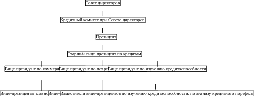 При данном подходе можно видеть, что два вице-президента осуществляют управление коммерческими и потребительскими ссудами и, кроме того, имеется отдел, который занимается анализом кредитоспособности как настоящих, так и предполагаемых заемщиков. По мере роста банковского учреждения, происходит процесс специализации и сегментации отдельных функций кредитования.