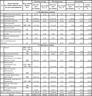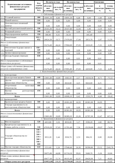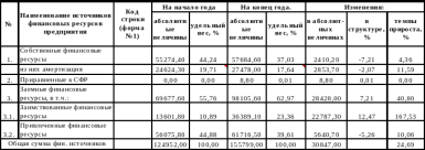 На начало года в общей структуре финансовых ресурсов более 10 % заняли следующие статьи: прочий дополнительный капитал (16,14 %), амортизация (19,71 %) и долгосрочные кредиты банков (10,89 %). На конец года – прочий дополнительный капитал (12,94 %), амортизация (17,64 %) и краткосрочные кредиты банков (16,93 %).