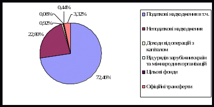Зазначені результати досягнуто завдяки покращенню адміністрування податків, підвищенню рівня податкової віддачі платників. Темпи росту надходжень податку на прибуток у 2008 році досягли 150,3%. до аналогічного періоду 2007 року (у 2007 році – 134,1%, у 2006 році – 99,3%). Збір податку на додану вартість у жовтні порівняно із середньомісячним зріс на 555 млн. грн., акцизного збору – на 198 млн. гривень. Питома вага надходжень місцевих бюджетів зросла із 40,6% у 2008 році до 45,3% у 2009 році, що дозволило суттєво зміцнити фінансову основу органів місцевого самоврядування. На основі даних Міністерства фінансів України можна дослідити структуру доходів Державного бюджету за 2007, 2008роки та ІІІ квартали 2009 року (табл.2.1.). Основним джерелом доходів Державного бюджету є податкові надходження – 72,46%, що видно з рисунку 2.4., з яких податок на прибуток підприємств, податок на додану вартість, акцизний збір та ввізне мито у загальній структурі доходів Державного бюджету за 2008 рік становлять 20,48%, 39,74%, 5,47% та 5,15% відповідно.