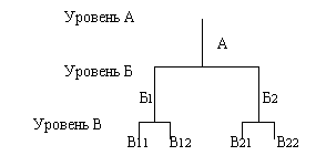 Метод “дерева целей” (рисунок 1.) используется при анализе систем, объектов, процессов, в которых можно выделить несколько структурных или иерархических уровней. “Дерево целей” строится путем последовательного выделения все более мелких компонентов на понижающихся уровнях. На рисунке показано, что каждая ветвь на каждом уровне разделяется на два ответвления следующего, более низкого уровня.