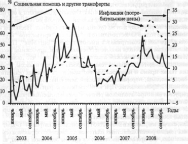 Рис. 4. Украина: темпы прироста потребительских цен, социальной помощи и других полученных населением трансфертов в 2003-2008 гг.