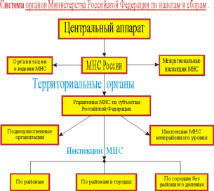 В соответствии со ст. 1 Закона РФ "О налоговых органах Российской Федерации" (в ред. от 08. 07. 99 № 151-ФЗ), - они образуют единую систему контроля за соблюдением налогового законодательства России, правильностью исчисления, полнотой и своевременностью внесения в соответствующие бюджеты и внебюджетные фонды налогов и других обязательных платежей, а также контроля в пределах компетенции, за соблюдением валютного законодательства. В ст. 2 закона определено, что единая централизованная система налоговых органов состоит из Министерства Российской Федерации по налогам и сборам и его территориальных органов. Постановление Правительства Российской Федерации от 16.10.2000 № 783 (Положение о министерстве Российской Федерации о налогах и сборах (ст.1)) дополняет уже названные главные задачи, решение которых возложено на МНС России
