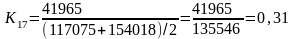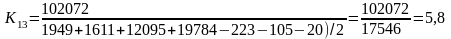 | Коэффициент оборачиваемости обшей задолженности (К13) | ≥ 6 | 5,8 | -,002 |