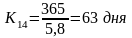6) Средний срок оборота общей задолженности(К14) определяется как отношение количества дней в году (квартале, месяце) к коэффициенту оборачиваемости общей задолженности: