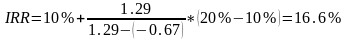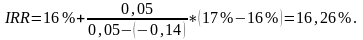 Для уточнения полученного значения берем диапазон от r1 = 16% до r2 = 17%. При r = 16% NPV=0,05; при к=17% NPV=-0,14. Тогда
