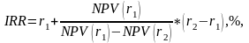 где r1 – величина доходности (процентной ставки), при которой NPV положителен,%; r2 – величина доходности (процентной ставки), при которой NPV отрицателен,%; NPV(r1) – абсолютная величина NPV при r1; NPV(r2) – абсолютная величина NPV при r2.