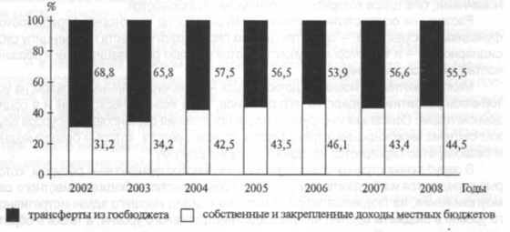 Из рисунка 1 видно, что доля трансфертов из госбюджета в общем объеме доходов местных бюджетов составляет в среднем 40,7%. Во времени эта динамика несколько меняется. Например, начиная с 2004 г. доля трансфертов возросла против 2003 г. на 8,3 процентного пункта, ибо расширились новые виды дополнительных привлечений средств в местные бюджеты за счет внедрения техногенных субвенций и субвенций на социально-экономическое развитие. В 2008 г. по сравнению с 2007 г. доля трансфертов тоже выросла, но не так существенно - всего на 1,1 процентного пункта. Если же сравнить показатели за 2008 и 2002 годы, то увидим, что рост составил 13,3%. Доли трансфертов из госбюджета в разрезе регионов также ощутимо разнятся, например, в 2007 г. наблюдаются колебания от 12,0% в Киеве до 68,7% в Тернопольской области.