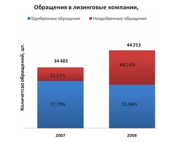 При этом спрос на лизинговые услуги значительно возрос. Компании, сохранившие источники финансирования, получили возможность выбирать наиболее перспективные с точки зрения «качества» заемщика и объекта лизинга заявки. Количество обращений в лизинговые компании выросло на 22% и достигло 44 253. При этом число одобренных и профинансированных обращений сократилось на 8,5% и составило 24 712. Таким образом видно, что доля одобренных обращений в 2008 году ровна 55,8 % от общего их числа. В то время как в прошлом году эта цифра составляла 77,7%. При этом в абсолютном выражении число одобренных заявок выросло, в том числе за счет смещения акцента в сторону более мелких контрактов с более низким уровнем кредитного риска (рис. 3).