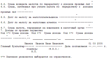 В разд.7 отражаются суммы дохода, полученные физическими лицами - налоговыми резидентами Российской Федерации от реализации любого имущества, принадлежащего им на праве собственности. Код дохода в зависимости от вида проданного имущества берется из справочников. По условиям нашего примера разд.6 и 7 не заполняются.