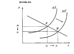 При снижении предельных налоговых ставок возрастут предложение труда и стимулы к предпринимательству, увеличатся сбережения и инвестиции. Это поможет нам перейти от кривой AS к кривой AS' (более высокой кривой предложения). В результате этого снижается уровень цен (с pe до p1)