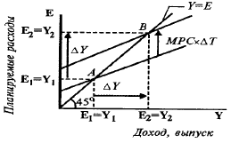 Мультипликативное воздействие на равновесный уровень дохода оказывает и изменение суммы налогов Т. Так, если налоговые отчисления снижаются на величину AT, то располагаемый доход Yd = Y -Т возрастает на величину AT (рис.1). Потребительские расходы, соответственно, увеличиваются на величину ATхМРС, что сдвигает вверх кривую планируемых расходов и увеличивает равновесный объем производства от Y1 ДО Y2. Рост совокупного дохода, в свою очередь, повышает и располагаемый доход, а значит и потребительские расходы (на величину ATxМРС ), что снова вызывает рост ВНП. Его общий прирост может быть определен по следующей формуле: