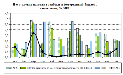 Поступления налога на прибыль в 2009 году оказались рекордно низкими и упали по сравнению с 2008 годом на 1,3 % ВВП. Однако стоит отметить, что снижение поступлений по налогу на прибыль в федеральный бюджет, на 87% (1,1 % ВВП) объясняется так называемым «эффектом ставки», в то время как «эффект базы» - т.е. снижение доли прибыли в ВВП в результате кризиса – был менее существенным и составил всего 13% (0,2 % ВВП).