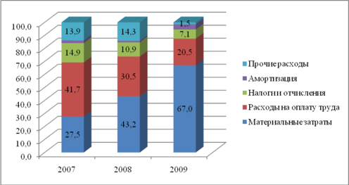 Рисунок 2. – Структура себестоимости по экономическим элементам, 2007-2009 гг