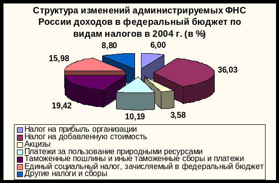 Прежде всего, обращает на себя внимание доля налоговых доходов, которая в 2000 г. составляла 84,7% структуры доходов, а в 2004 г. – 75,5%. По значимости в доходах федерального бюджета в 2004 г. можно выделить: налог на добавленную стоимость – 36,03%; таможенные пошлины, иные таможенные сборы и платежи – 19,42; платежи за пользование природными ресурсами – 10,19%. Наибольший прирост по сравнению с 2003 г. дали таможенные пошлины и иные таможенные сборы и платежи (+5,53%).