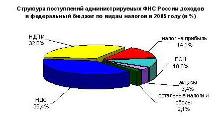 Основная масса администрируемых ФНС России доходов федерального бюджета была обеспечена поступлениями НДС (38,4%), налога на добычу полезных ископаемых (32,0%), налога на прибыль (14,1%), единого социального налога (10,0%) и акцизов (3,4%).