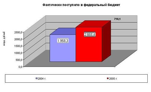 Налога на добычу полезных ископаемых (далее – НДПИ) в 2005 году поступило в федеральный бюджет 854,5 млрд. рублей, в том числе: на добычу нефти – 761,3 млрд. рублей; на добычу газа горючего природного – 79,2 млрд. рублей; на добычу газового конденсата из всех видов месторождений – 5,0 млрд. рублей.