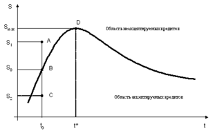 Максимальна сума кредиту, на яку може претендувати позичальник – Smax (точка D), і ця сума може бути видана тільки на час t*.