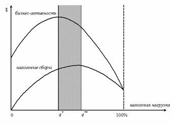В практике экономических исследований существует понятие предельного значения налоговой нагрузки, при превышении которого объем производства начинает сокращаться. Обозначим эту точку q*. Вместе с тем, есть и другая критическая величина налоговой нагрузки q**, при которой фискальные поступления в бюджет максимальны и дальнейшее увеличение налогов не имеет смысла.