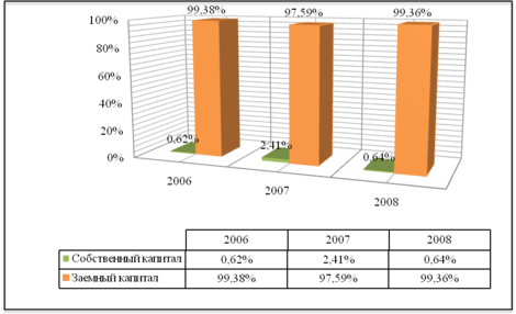 Данные таблицы 2.1 свидетельствуют о том, что имущество предприятия сформировано в основном за счет заемных источников (2582 млн. р. в 2006 году и 52587 млн. р. в 2008 году). Доля заемного капитала в источниках финансирования на 2006 год составляла 98,39% и 99,36% – на конец года. Финансовая деятельность предприятия построена на привлечении заемных средств практически при полном отсутствии собственного капитала. Поэтому анализ его деятельности следует рассматривать в ракурсе соотношения абсолютной величины заемных средств с учетов платы за их пользование (процентов) к сумме финансовой оценки незавершенного строительства (реализуемого проекта) созданного в результате его работы.