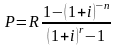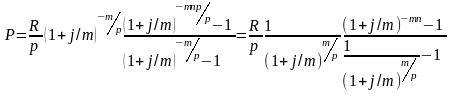 Данный ряд представляет собой геометрическую прогрессию со знаменателем (1+j/m)-m/p, первым членом прогрессии и числом членов прогрессии nmp. Подставив данные в вышеуказанную формулу получаем сумму дисконтированных платежей или современную стоимость (Р) p-срочной ренты: