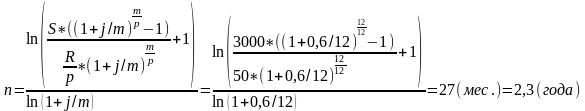 Ответ: n = 2,3 года, или необходимую сумму в 3 000 д.ед. можно накопить в течение 2 лет 3 месяцев, если ежемесячно вносить в банк 50 д.ед. под 60 % годовых.