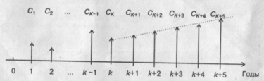 Из приведенной схемы видно, что в первые k лет прогнозируется бессистемное изменение величины годового дивиденда, а начиная с момента (k + /), эта величина равномерно увеличивается, т.е. 392