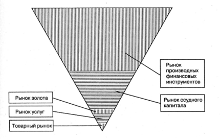 Причем, если в относительных пропорциях сопоставить стоимостные объемы рынков товаров, услуг и кредитов, то объем ссудного капитала будет значительно превосходить свое реальное стоимостное выражение. Качественно соотношение между объемами средств, обращающихся на рынке реальных товаров и услуг, и объемами средств рынка ссудного капитала представлено на рис. 4