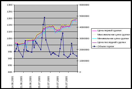 Из графиков мы видим, что за анализируемый период существовала повышательная тенденция на рост акций компании Лукойл. В основном превалировала бычья тенденция. Объемы торгов были максимальными в начале июля, а концу июля наоборот, резко снизились объемы торгов.