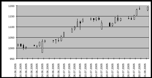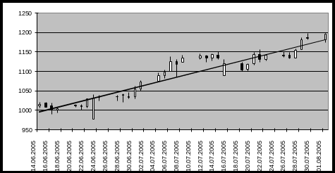 Из графика мы видим, что за анализируемый период существовала повышательная тенденция. В основном превалировала бычья тенденция. Откаты были, но они были несущественны.