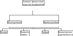 Заемный финансовые средства предприятия (рис.1.2) - это кредиты банков и финансовых компаний, займы, кредиторская задолженность, лизинг, коммерческие бумаги и др., иначе это называется еще заемным капиталом предприятия. Он подразделяется на долгосрочный (более года) и краткосрочный (до года).