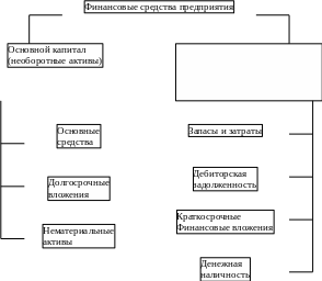 Используются финансовые средства предприятия на приобретение и аренду основных средств, нематериальных активов, строительство объектов производственного и непроизводственного назначения, закупку сырья, материалов, топлива, энергии, оплату труда работников предприятия, уплату налогов, процентов за кредиты, дивидендов и т.д., т.е. он может быть вложен в долгосрочные активы и оборотные (текущие) активы (рис.1.3). Долгосрочные активы создаются, как правило, за счет собственного капитала и долгосрочных кредитов банка и займов. Текущие затраты финансируются за счет собственного и заемного капитала.