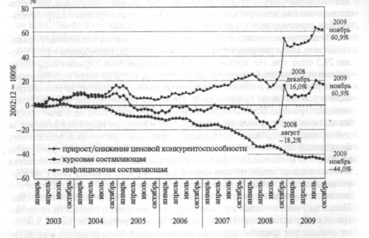 Регулярно проводимые в Институте экономики и прогнозирования НАН Украины оценки динамики и уровня ценовой конкурентоспособности свидетельствуют, что инфляция, по сути, была главной причиной снижения ценовой конкурентоспособности экономики Украины (см. рис. 2). По итогам ноября 2009 г., инфляционная составляющая обусловила снижение ценовой конкурентоспособности на 44%, а курсовая - рост на 60,9%. В этом проявился эффект обесценения доллара за время наблюдений, что и предопределило возможности ускорить во II половине 2009 г. рост экспорта в сравнении с импортом и улучшить показатели текущего счета платежного баланса с -12,9 млрд. дол. в 2008 г. до -1,5 млрд. дол.