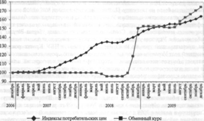 ис. 1. Накопительная динамика индексов потребительских цен и обменного курса в 2007-2009 гг., в % к декабрю 2006 г.