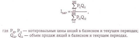Большую известность получил другой американский индекс — S&P-500 (Standard and Poor's). Он охватывает акции 500 компаний, в том числе 425 промышленных. Его основная особенность заключается в том, что при расчете не используется принцип равновзвешенности цен по числу проданных акций. Таким образом, он отражает роль каждого набора акций в процессе их реализации и учитывает степень влияния на результат наиболее активных акций с большей массой стоимости. Формула для его расчета имеет следующий вид: