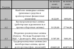 Анализ ликвидности предприятия по базовым коэффициентам должен дополняться одновременно анализом структуры активов и пассивов баланса по классу ликвидности. В приведённых ниже таблицах приведены в порядке убывания возможности их быстрой реализации (ликвидности) от наивысшего класса А1 (П1), до низшего класса А4 (П4).