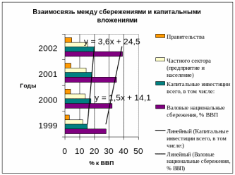 Коэффициент корреляции между уровнем валовых национальных инвестиций и уровнем сбережений равен 0,990139, что говорит о тесной взаимосвязи между ними.