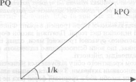 Ця формула отримала назву кембриджського рівняння. Графічно воно може бути інтерпретовано наступним чином. Відкладемо на осі ординат величину суспільного виробництва у фізичному виразі, а на осі абсцис — кількість грошей. Тоді kPQ буде представляти собою лінію, що виходить з початку координат. Тангенс кута нахилу kPQ до осі абсцис буде дорівнювати V= 1/k (рис. 5.2).