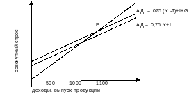 Таким образом, спрос на товары при первоначальном равновесном уровне доходов вырос на 100 единиц (из-за увеличения государственных закупок) и одновременно снизился на 75 (из-за увеличения налогов).