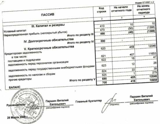 По таблице 1 видно, что первое не равенство не выполняется в балансе за 2006 и за 2007 год. Баланс считается не оптимальным. И по требованию кредиторов у организации просто не хватит средств, чтобы быстро погасить долги перед кредиторами. По сравнению 2006 и 2007 годом денежные средства увеличились в 2,5 раза (или на 3 тыс. руб.), но кредиторская задолженность выросла в 27 раз (или на 11589 тыс. руб.), положение организации по сравнению с 2007 годом не улучшилось. В таблице 2 - валюта баланса увеличилась на 2500% или на 10240 тыс. руб., это произошло за счёт увеличения дебиторской задолженности в активе баланса на 10189 тыс.руб. или на 2500% и кредиторской задолженности в пассиве баланса на 11588 тыс.руб. или на 2530%. Также в пассиве наблюдается убыток у организации, который всё больше увеличивается, по сравнению с 2007 годом он увеличился на 1338 тыс. руб. или 2676 % к валюте баланса. Даже увеличение денежных средств в 2,5 раза или 3 тыс. руб. или 150%, не улучшило положение организации. Запасы по сравнению с прошлым годом не изменились и составили 1 тыс.руб..Также в активе можно наблюдать основные средства они по сравнению с прошлым годом увеличились на 48 тыс.руб. Показатели ликвидности характеризуют: коэффициент абсолютной ликвидности, не соответствует норме и составляет 0,004 на начало и 0,0004 на конец года, то есть текущую краткосрочную задолженность организация не сможет погасить в ближайшее время за счёт денежных средств и приравненным к ним финансовым вложениям. Коэффициент «критической оценки» показывает, что за счет денежных средств и получение денежных средств от дебиторов можно будет погасить на 2006 или 2007 год краткосрочные обязательства организации, так коэффициенты соответствуют нормам и составляют на начало 0,91 и на конец 0,88. Коэффициент текущей ликвидности показывает, что часть текущих обязательств по кредитам и расчётам организация не погасит, мобилизовав все оборотные средства, так как составляет на начало 0,91 и на конец 0,88. Коэффициент обеспеченности собственными средствами характеризует недостаточное наличие собственных оборотных средств у организации, необходимых для её текущей деятельности, так как менее 0,1 на начало и на конец года. По таблице 4 – по показателям рентабельности видно, что предприятие не рентабельно, организация несёт 2006 году убытки и в 2007 году они увеличились. По показателям структуры капитала можно сделать вывод, что собственных средств в общей сумме источников финансирования нет у организации, так как коэффициент финансовой независимости не соответствует норме, также коэффициент капитализации (плечо финансового рычага) показывает, что заёмных средств организация не привлекла вложенных в активы собственных средств. Коэффициент общей оборачиваемости капитала (ресурсоотдача) показывает эффективность использования имущества. Скорость на начало года составила 25 оборотов (за период всего капитала организации) к концу году уменьшение на 14 оборотов, что составило 13 оборотов на конец года. Так же коэффициент оборачиваемости оборотных (мобильных) средств составил на начало года 25 оборотов и на конец года 14 оборотов, это означает что, скорость оборота всех оборотных средств организации (как материальных, так и денежных) снизилась на 14 оборотов. Фодоотдача составила 2911 на конец года, она показывает, что организация эффективно использует ос