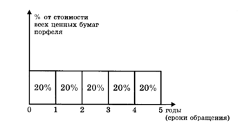 1. Метод лестницы. Основан на приобретении бумаг различной срочности в пределах инвестиционного горизонта. Например, предприятие хочет держать инвестиционный портфель в сумме 5000 гривен с пятилетним горизонтом. Если применить метод лестницы, то будут куплены одногодичные бумаги на 1000 гривен, двухгодичные - на 1000 гривен и т.д. Портфель будет равномерно распределён во всём временном интервале в 5 лет. Подобная стратегия легко реализуема на практике, т.к после истечения срока одногодичных ценных бумаг высвободившиеся средства будут автоматически вложены в пятилетние бумаги на ту же сумму. При использовании этого метода активность по инвестиционному счёту сводится к минимуму и предприятие получает среднюю норму дохода от своего портфеля.9 Графически стратегия "лестницы" выглядит следующим образом10: