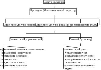 Организационная структура системы управления финансами хозяйствующего объекта, а также ее кадровый состав могут быть построены различными способами в зависимости от размеров предприятия и вида его деятельности. Для крупной компании наиболее характерно обособление специальной службы, руководимой вице-президентом по финансам (финансовым директором) и, как правило, включающей бухгалтерию и финансовый отдел (рис.2).