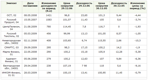 В 2006 г. в корпоративном секторе крупнейшими заемщиками стали эмитенты первого эшелона, в том числе ВТБ, ЛУКОЙЛ, ФСК ЕЭС, Банк Русский Стандарт и Газпром. В муниципальном сегменте лидерство сохранили бумаги Москвы и Московской области. Кроме того, во всех сегментах долгового рынка наблюдался рост биржевых оборотов. Наибольшей популярностью в течение года у инвесторов пользовались эталонные выпуски ОФЗ со сроком до погашения 10 и 15 лет.