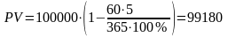 Номинальная цена векселя 100000 руб., ставка дисконта 5%, до погашения остается 60 дней. Определить цену векселя.