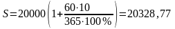 Номинал векселя равен 20000 руб., по векселю начисляются 10% годовых, с начала начисления процентов до момента предъявления векселя к оплате прошло 60 дней. Определить сумму, которую получит держатель процентного векселя при его погашении.
