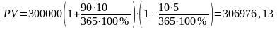 Номинальная цена векселя составляет 300000 руб., по векселю начисляются 10% годовых, с начала начисления процентов до момента предъявления векселя к оплате прошло 90 дней, а число дней, оставшихся до погашения векселя составляет 10 дней. Ставка дисконта по векселю 5%. Определить текущую цену векселя.