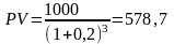 Номинальная стоимость бескупонной облигации равняется 1000 руб. На рынке доходность на инвестиции с уровнем риска, соответствующим данной облигации, оценивается в 20%. Срок обращения облигации – 3 года. Рассчитать текущую (курсовую) стоимость.